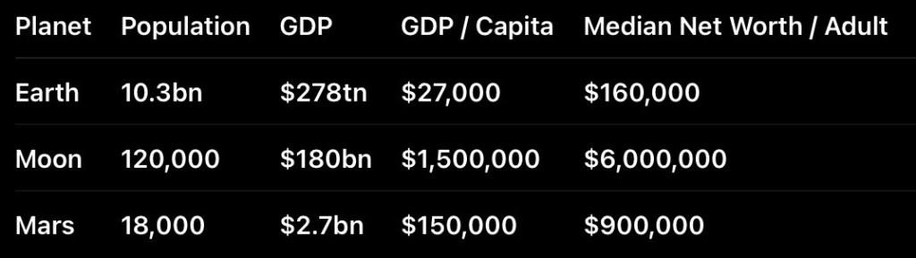 The Moon’s edge is simple: extreme capital intensity, tiny labour base, and strategic scarcity. A small population operating high-value infrastructure — transport, power, communications, robotics and early resource processing — can produce extraordinary output per resident. This is why the Moon, not Mars, is the most likely first off-Earth economy to generate million-dollar GDP per capita. Mars remains the superior long-duration civilization platform, but in the close future it is not the wealth leader.